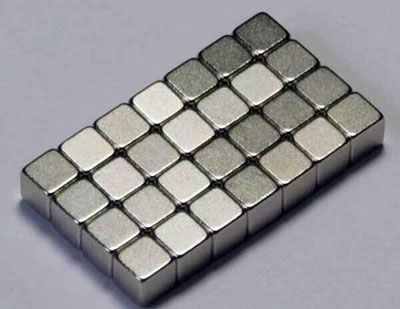 稀土材料因為具備非常好的磁特性,對于制備風力渦輪機,電動汽車和混合動力汽車以及家用電子器件至關(guān)重要。但是同時他們也具有價格敖貴和來源單一(只有中國有)的特點。然而,根據(jù)美國電子能源公司的消息,電動機使用磁鐵將電能轉(zhuǎn)換成機械能,一個很小尺寸的燒結(jié)的稀土磁體便能夠產(chǎn)生非常強大的磁場,這使制造商能夠制備更小和更輕的汽車成為可能。這家公司已經(jīng)與美國特拉華大學研究人員合作以尋找一種能夠?qū)⑾⊥链盆F的電阻率提高至少30%的制備工藝。他們的目標是利用電阻率增加的磁鐵即使在汽車高速運轉(zhuǎn)時也能降低發(fā)動機的效率損失。上圖便是塊狀的鍍鎳的釹磁鐵,是世界上使用最廣泛的一種稀土磁鐵之一。