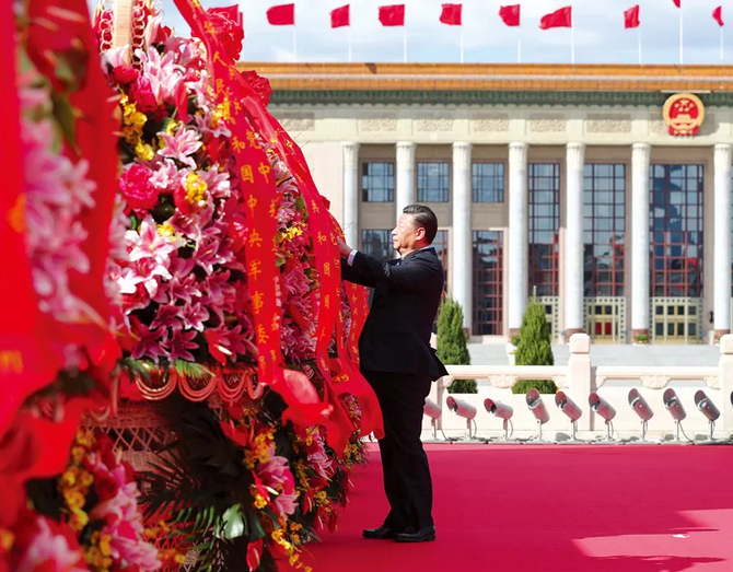出席烈士紀(jì)念日向人民英雄敬獻(xiàn)花籃儀式。這是習(xí)近平整理花籃上的緞帶。新華社記者 謝環(huán)馳/攝