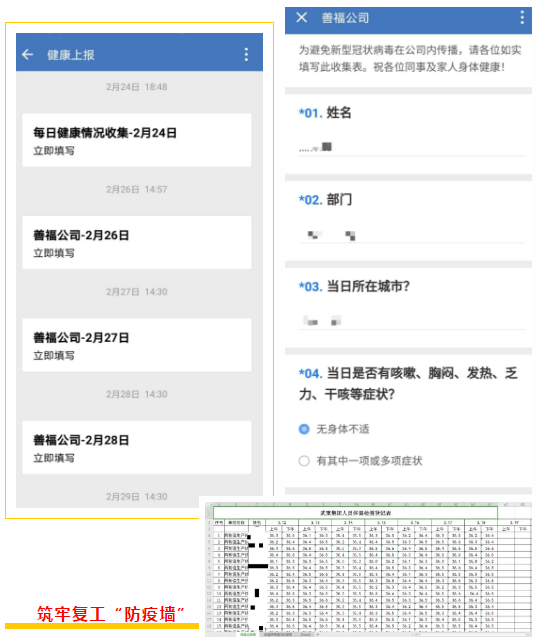 “復(fù)工任務(wù)雖急,人員安全更重,必須把好人員進(jìn)場第一關(guān)。”在人員進(jìn)場管控上,武重集團(tuán)建立了這樣一條“硬核規(guī)定”:員工必須每天通過企業(yè)微信提交體溫信息,建立員工健康檔案,筑牢復(fù)工“防疫墻”。
