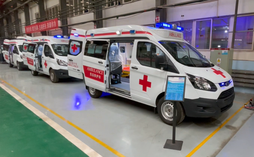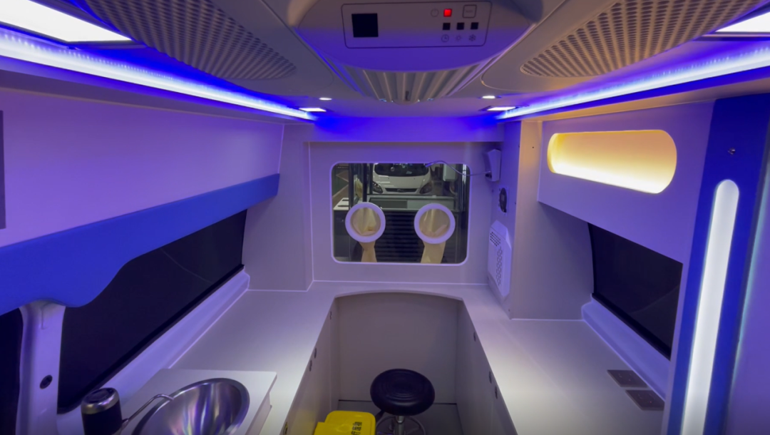 核酸采樣車采用福特新全順中軸中頂汽油款底盤,外觀與普通救護車類似,內(nèi)部上裝醫(yī)療輔助系統(tǒng)、空調(diào)系統(tǒng)、照明系統(tǒng)、新風過濾系統(tǒng)等。其中,最為核心的醫(yī)療輔助系統(tǒng)包括采樣窗口、隔離手套、車載冰箱、洗手池系統(tǒng)、凈水桶、污水箱、污物桶、車載飲水機等。