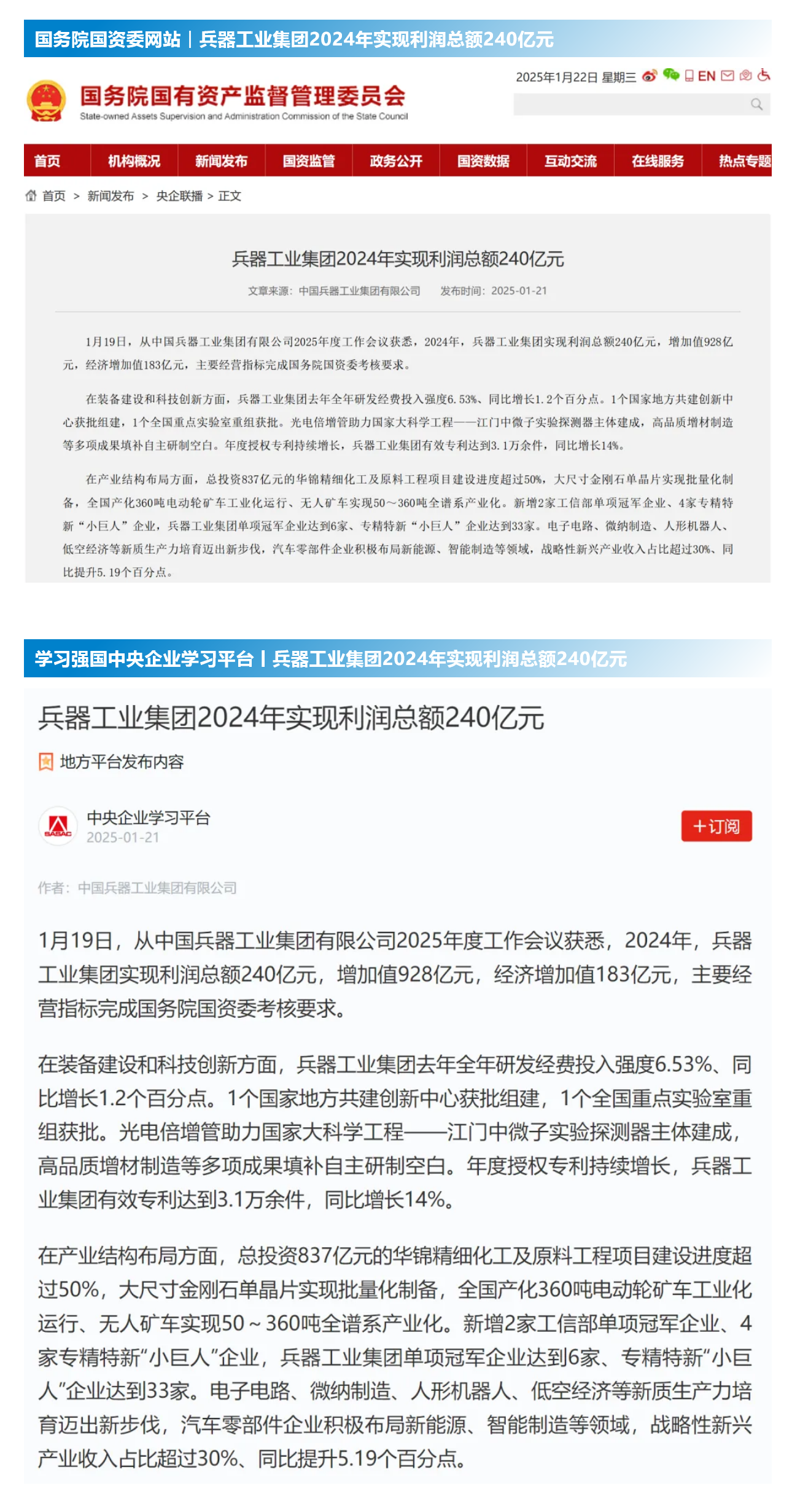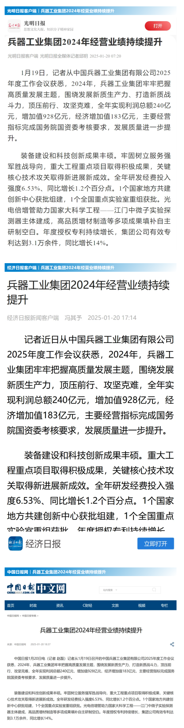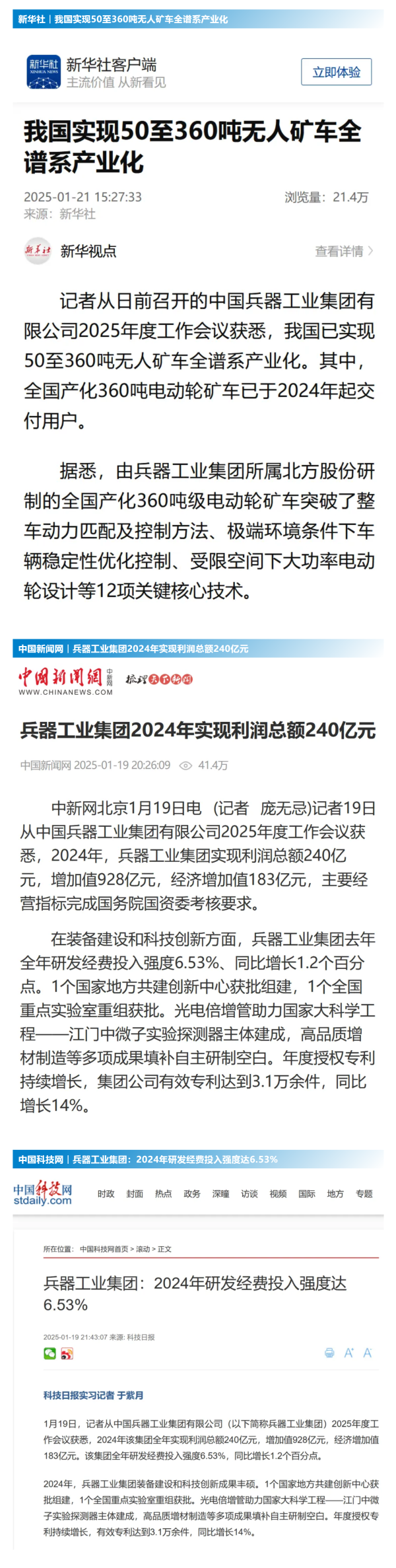 1月19日至20日,中國兵器工業(yè)集團(tuán)有限公司2025年度工作會議在京召開,會議總結(jié)2024年工作,分析形勢任務(wù),明確工作思路,部署2025年工作。 集團(tuán)公司2024年取得的成績及下一步重點(diǎn)工作受到社會媒體廣泛關(guān)注。新華社、中國新聞網(wǎng)、中國科技網(wǎng)、光明日報(bào)客戶端、經(jīng)濟(jì)日報(bào)客戶端、中國日報(bào)網(wǎng)、國務(wù)院國資委網(wǎng)站、學(xué)習(xí)強(qiáng)國中央企業(yè)學(xué)習(xí)平臺、新浪網(wǎng)、網(wǎng)易網(wǎng)、搜狐網(wǎng)、騰訊網(wǎng)、鳳凰網(wǎng)等中央主流媒體、國家部委網(wǎng)站及知名網(wǎng)絡(luò)媒體對集團(tuán)公司2025年度工作會議進(jìn)行了報(bào)道,重點(diǎn)關(guān)注集團(tuán)公司經(jīng)營業(yè)績、科技創(chuàng)新、產(chǎn)業(yè)結(jié)構(gòu)布局優(yōu)化等情況。其中,新華社以《我國實(shí)現(xiàn)50至360噸無人礦車全譜系產(chǎn)業(yè)化》為題,重點(diǎn)報(bào)道了集團(tuán)公司在推動智能制造水平提升方面取得的成效;中國新聞網(wǎng)、光明日報(bào)客戶端、經(jīng)濟(jì)日報(bào)客戶端、中國日報(bào)網(wǎng)等就集團(tuán)公司2024年度經(jīng)營業(yè)績及各項(xiàng)工作取得的成果進(jìn)行報(bào)道;中國科技網(wǎng)著重報(bào)道了集團(tuán)公司在科技創(chuàng)新和優(yōu)化產(chǎn)業(yè)結(jié)構(gòu)布局方面的最新進(jìn)展。集團(tuán)公司門戶網(wǎng)站、微信公眾號、微博等新媒體平臺以及《中國兵工報(bào)》也對集團(tuán)公司工作會議進(jìn)行了及時(shí)報(bào)道,各成員單位紛紛對相關(guān)內(nèi)容進(jìn)行轉(zhuǎn)載,引發(fā)全系統(tǒng)關(guān)注。 集團(tuán)公司職工及廣大網(wǎng)友熱議工作會 “2025年工作會為我們指明了發(fā)展方向、明確了奮斗目標(biāo),面對全新的機(jī)遇和挑戰(zhàn),作為兵工人深感責(zé)任重大?!?/p> “科技是第一生產(chǎn)力,一定要以科技創(chuàng)新引領(lǐng)新質(zhì)生產(chǎn)力發(fā)展,為高質(zhì)量發(fā)展提供支撐?!?/p> “把各項(xiàng)工作做深、做實(shí)、做細(xì),努力為集團(tuán)公司高質(zhì)量發(fā)展添磚加瓦。” “2024年中國兵器展示了大國重器,祝新的一年中再創(chuàng)輝煌!” |