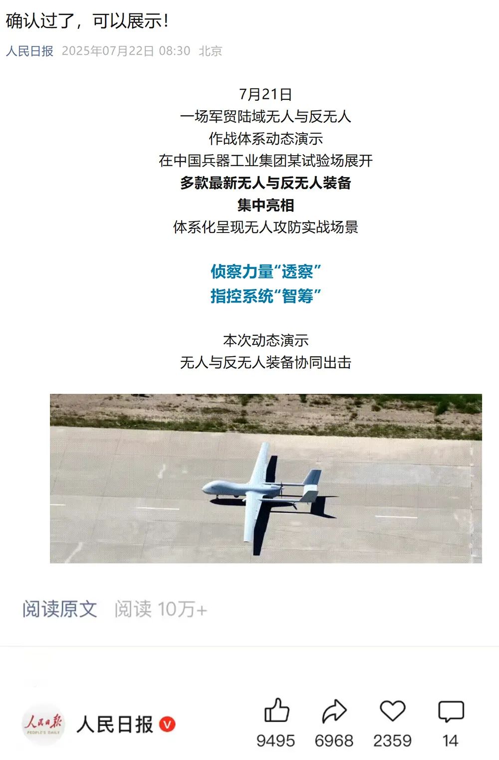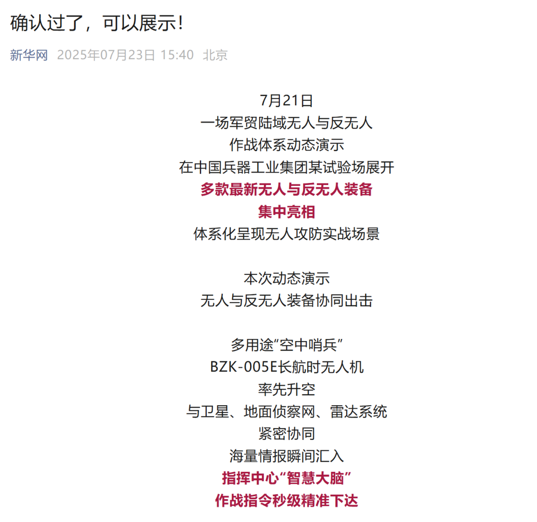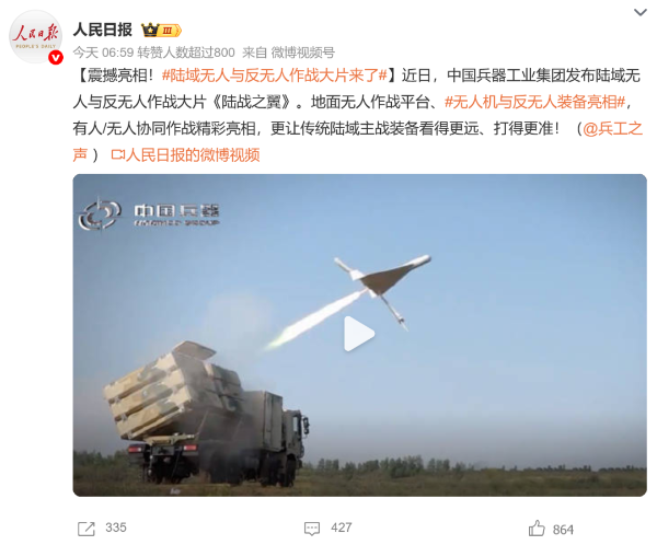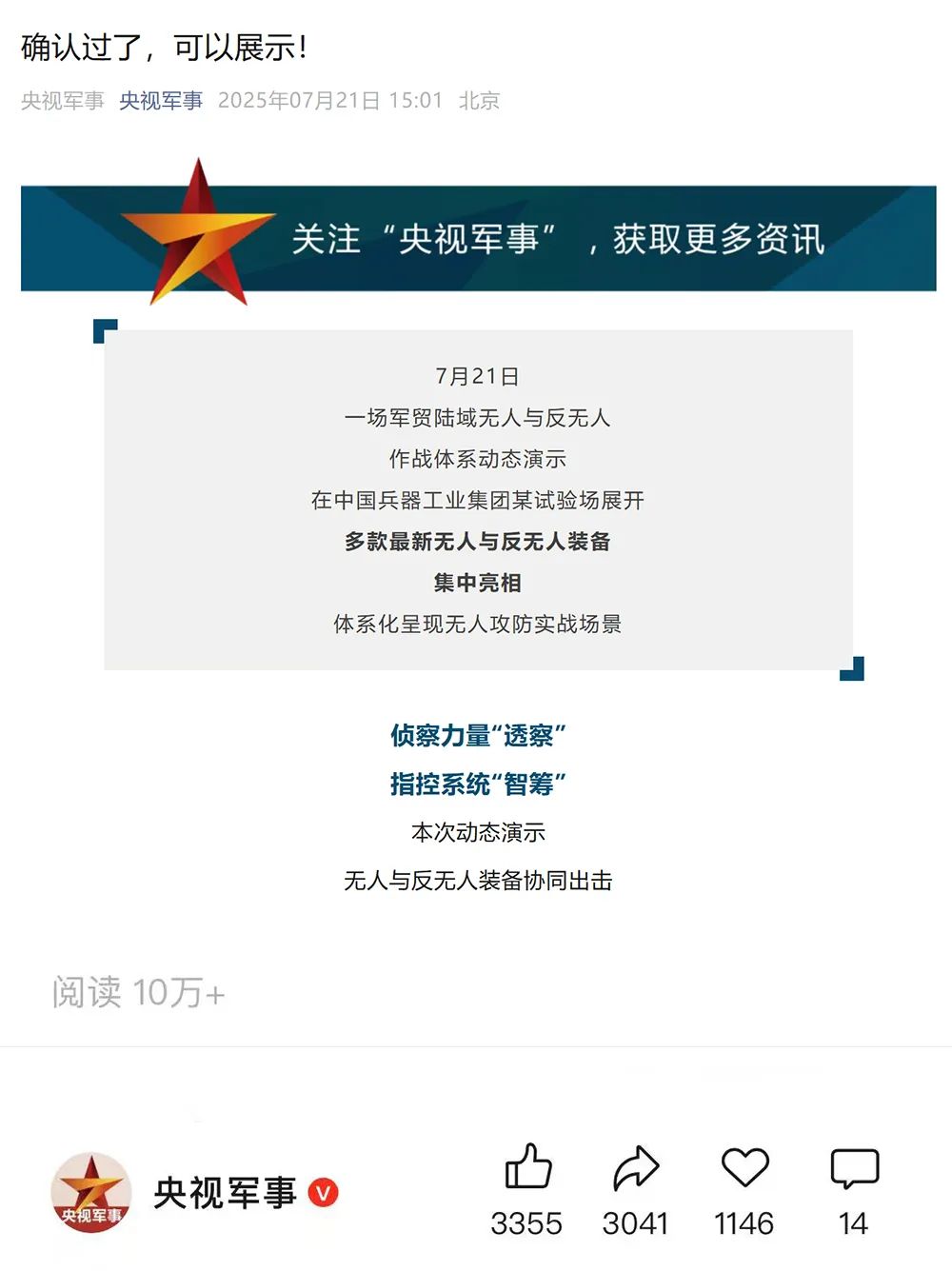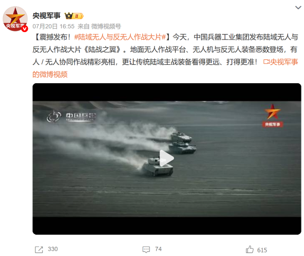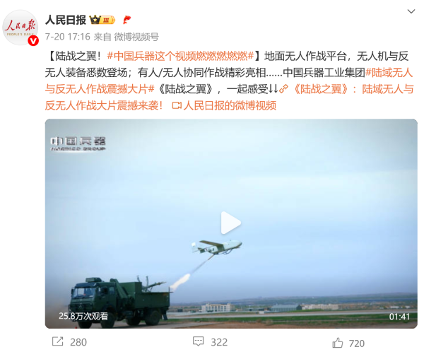 7月21日,中國兵器工業(yè)集團(tuán)有限公司在位于內(nèi)蒙古的某試驗(yàn)場舉辦軍貿(mào)陸域無人與反無人作戰(zhàn)體系主題日活動(dòng),攜無人機(jī)、巡飛彈、反無人機(jī)等最新武器裝備登場亮相,展現(xiàn)了一場無人與反無人領(lǐng)域激烈對(duì)抗的實(shí)戰(zhàn)場景。中央主流媒體、地方媒體、知名網(wǎng)絡(luò)媒體,以及集團(tuán)公司各宣傳平臺(tái)紛紛進(jìn)行報(bào)道,多次登上熱搜,引發(fā)廣泛關(guān)注。 央視新聞?lì)l道《新聞直播間》《東方時(shí)空》《24小時(shí)》、國防軍事頻道《正午國防軍事》《軍事報(bào)道》《國防軍事早報(bào)》、中文國際頻道《今日環(huán)球》、央視軍事新媒體等報(bào)道了集團(tuán)公司軍貿(mào)陸域無人與反無人作戰(zhàn)體系首次公開實(shí)裝動(dòng)態(tài)演示有關(guān)情況,重點(diǎn)介紹了無人與反無人作戰(zhàn)最新裝備。 央視新聞?lì)l道《新聞直播間》:內(nèi)蒙古 軍貿(mào)陸域無人與反無人作戰(zhàn)最新裝備亮相 央視新聞?lì)l道《新聞直播間》:內(nèi)蒙古 軍貿(mào)陸域無人與反無人作戰(zhàn)最新裝備亮相 記者探訪無人裝備展區(qū) 央視新聞?lì)l道《新聞直播間》:軍貿(mào)陸域無人與反無人作戰(zhàn)最新裝備亮相·記者探訪 最強(qiáng)“盾牌” 反無人機(jī)系統(tǒng)新升級(jí) 人民日?qǐng)?bào)微博、央視軍事微博、央視新聞客戶端、中國新聞網(wǎng)、中新社國是直通車抖音、環(huán)球網(wǎng)微博、環(huán)球時(shí)報(bào)(X平臺(tái)、英文版客戶端)、中國日?qǐng)?bào)網(wǎng)、央視軍事報(bào)道微博、中國軍號(hào)微博、中央廣播電視總臺(tái)“空天逐夢(mèng)”微信視頻號(hào)、共青團(tuán)中央B站、國資小新微博等中央主流媒體、國家部委的新媒體播發(fā)集團(tuán)公司陸域無人與反無人作戰(zhàn)大片等視頻作品。 人民日?qǐng)?bào)微博 央視軍事微博 人民日?qǐng)?bào)、新華網(wǎng)、央視軍事、央視新聞、中央廣播電視總臺(tái)中國之聲、中國新聞網(wǎng)、中國日?qǐng)?bào)網(wǎng)、中國日?qǐng)?bào)英文報(bào)刊《CHINA DAILY》、《科技日?qǐng)?bào)》、光明日?qǐng)?bào)客戶端、環(huán)球網(wǎng)、環(huán)球時(shí)報(bào)、人民日?qǐng)?bào)海外版-海外網(wǎng)、央視網(wǎng)、小央視頻、參考消息、瞭望東方周刊、共青團(tuán)中央、國資小新新媒體、新浪網(wǎng)、騰訊網(wǎng)、搜狐網(wǎng)、鳳凰網(wǎng)、網(wǎng)易網(wǎng)等中央主流媒體、國家部委的新媒體及知名網(wǎng)絡(luò)媒體對(duì)集團(tuán)公司軍貿(mào)陸域無人與反無人作戰(zhàn)體系主題日活動(dòng)進(jìn)行了圖文、音頻、視頻報(bào)道。 央視軍事微信 人民日?qǐng)?bào)微信 新華網(wǎng)微信 來源/各主流媒體 |